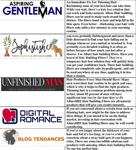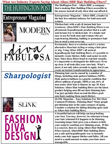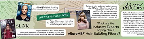 Allure Hair Building Fibers is the perfect hair loss solution for both men and women who want an all-natural, hypoallergenic, safe and truly effective way to instantly eliminate the appearance of hair loss and thinning hair. The all natural, hypoallergenic hair building fibers conceal, blend and add volume to your hair in just seconds. In less than 30 seconds, Allure will be able to conceal thinning areas, and create a perfectly natural looking head of hair. Most importantly, Allure Hair Building Fibers are not made from harsh chemicals like fake color sprays and shoe polish. Allure HBF is simple and easy to use. Simply shake Allure Hair Building Fibers onto the thinning areas on your head and watch as the hair fibers statically bond securely to your existing hair, instantly adding real density and volume to your thinning areas. In fact, the bond is so strong, the hair fibers even withstand rain, wind and sweat. Allure Hair Building Fiber's All Natural, Hypoallergenic Ingredients Most other hair fibers contain dangerous animal ingredients, synthetic dyes or chemicals, artificial fillers and preservatives. Allure HBF uses a patented all-natural formula that can be applied even on the most sensitive skin without causing any irritation at all. The hair fibers are made from the Gossypium Herbaceum, an all-natural fiber extracted from a plant that only grows in the arid sub-Saharan region. These plant fibers bond up to 200% stronger than regular hair fibers, which are usually made of other non-natural substances or wool and are marketed under different names like keratin protein. Use Allure HBF Spray for even longer-lasting results and added shine. This fine, quick dry mist is designed to further strengthen the bond between Allure HBF and fine or thinning hair. Note: If you just order a HBF, it is highly recommended that you order an Allure Hair Building Locking Spray by WeSellExpress ($9.99) for strengthening the bond between Allure HBF and fine or thinning hair.Feature
