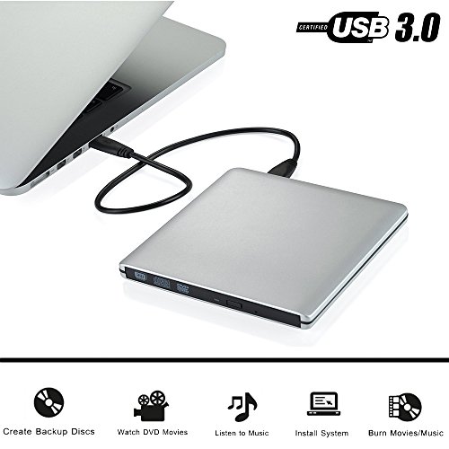 External DVD CD DRIVE USB 3.0 Aluminum Ultra Slim CD DVD Writer/Burner/Rewriter CD DVD+/-RW For High Speed Data Transfer for Apple Macbook Pro Windows 8/10 Laptop PC by Aooking Tech (Silver)