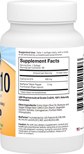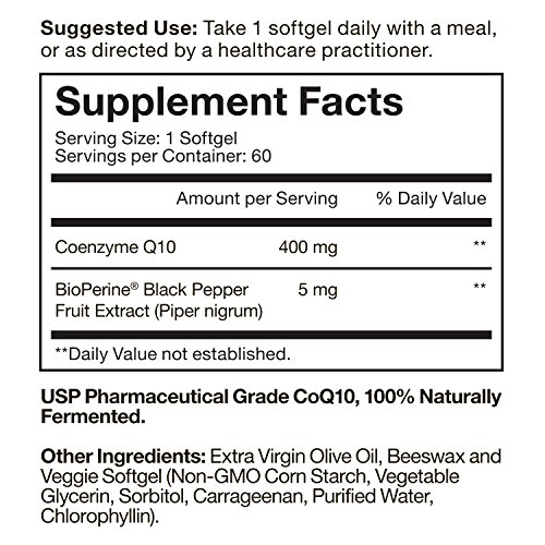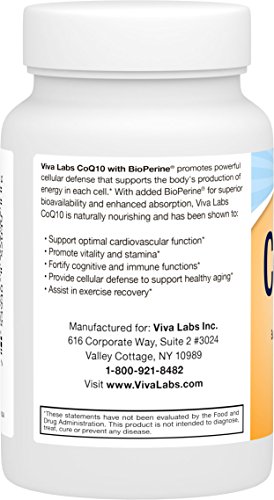 - Feature : HIGH POTENCY VEGAN FORMULA - Achieve the daily cellular support you need in just one small, easy-to-swallow veggie softgel featuring 400mg of coQ10 with 60 servings per bottle. Encapsulated in veggie softgels for restricted diets! / ENHANCED BIOAVAILABILITY - Viva Labs CoQ10 features naturally derived BioPerine, a patented black pepper extract shown to improve the absorption of coQ10 by at least 30%. Each softgel provides 5mg of this powerful compound, significantly enhancing bioavailability and absorption. / CARDIOVASCULAR AND CIRCULATORY HEALTH SUPPORT - CoQ10 has been clinically shown to promote heart health by supplying energy to the heart, strengthening heart muscle and improving oxygen delivery. / BOOST ENERGY LEVELS NATURALLY - CoQ10 is a powerful compound known to support endurance by defending cells against the effects of oxidation for enhanced athletic performance. / Made in the USA in GMP Certified Facilities