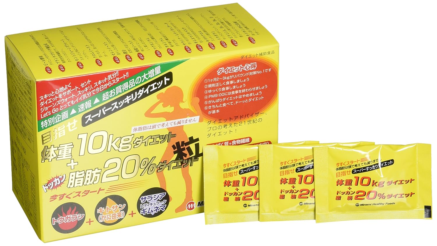 「目指せ体重10kgダイエット+ドッカン脂肪20%ダイエット粒6粒*75袋」は、サラシア、ギムネマ、キダチアロエ、唐辛子(トウガラシ)、キトサン等を配合したサプリメントです。お得な大容量サイズ。毎日の健康と美容のためにお役立て下さい。