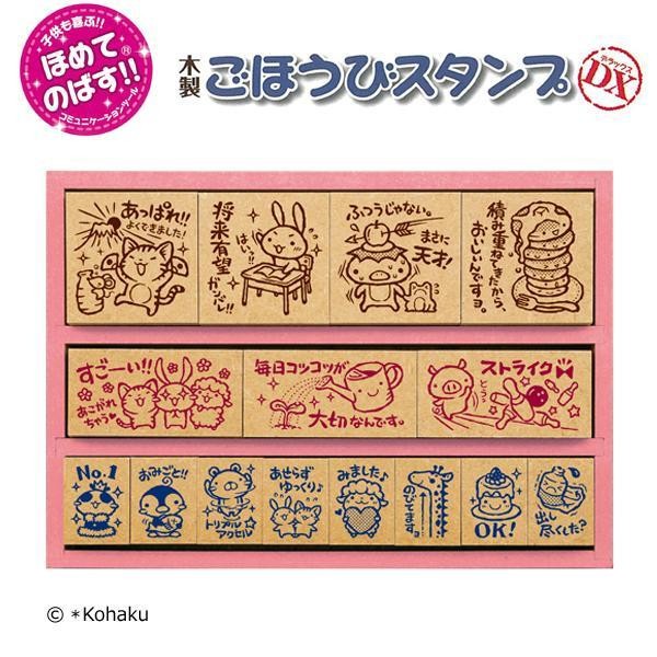 | 大・中・小の3サイズのスタンプが15個入ったDXセット。テストやドリル、連絡帳やメモなど使い方も様々です。木製収納BOX入り。 |