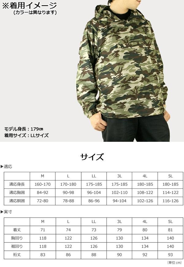 風よけ汚れよけに最適です。ひっくり返すと胸ポケットに本体を収納できますので、持ち運びにも便利です。 製造国:ミャンマー、中国 素材・材質:ナイロン100% 仕様:手洗い可 ※サプライヤー直送品 ご注文後2~3営業日後の出荷となります【商品名】カジメイク 迷彩ヤッケ グレー M 2217