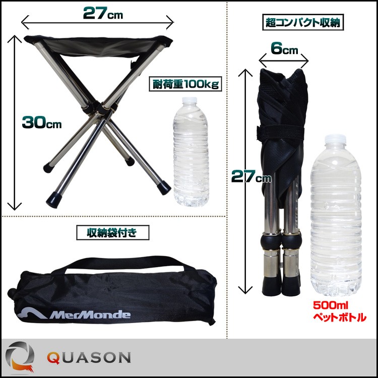 商品説明:■収納時27×6×6cmと超コンパクトだからバッグにも収納可能!■最新構造でコンパクトながら耐荷重120kgと、かなり丈夫なのが特徴です!■アウトドアはもちろん、釣りや運動会等、活躍の場は広いです!■持ち運びに便利な収納袋付き! サイズ:【サイズ(約)】高さ30×27×27cm【収納サイズ(約)】27×6×6cm 重さ(約):500g フレーム素材:超々ジュラルミン