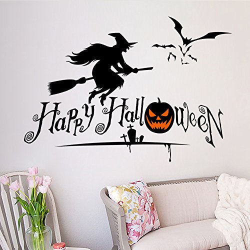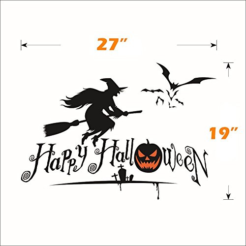 Boodecal Happy Halloween with Flying Witch and Bats Art Design for House Decoration Removable Halloween Series Wall Decals