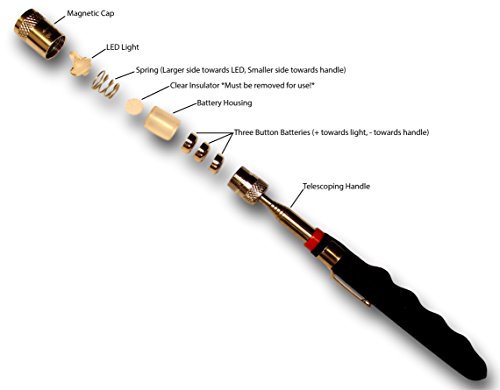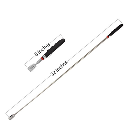 - DURABLE DESIGN - Strong magnet (8LB lift capacity), rubber grip handle, telescoping rod (7.5" unextended, 32" fully extended) and super bright LED light