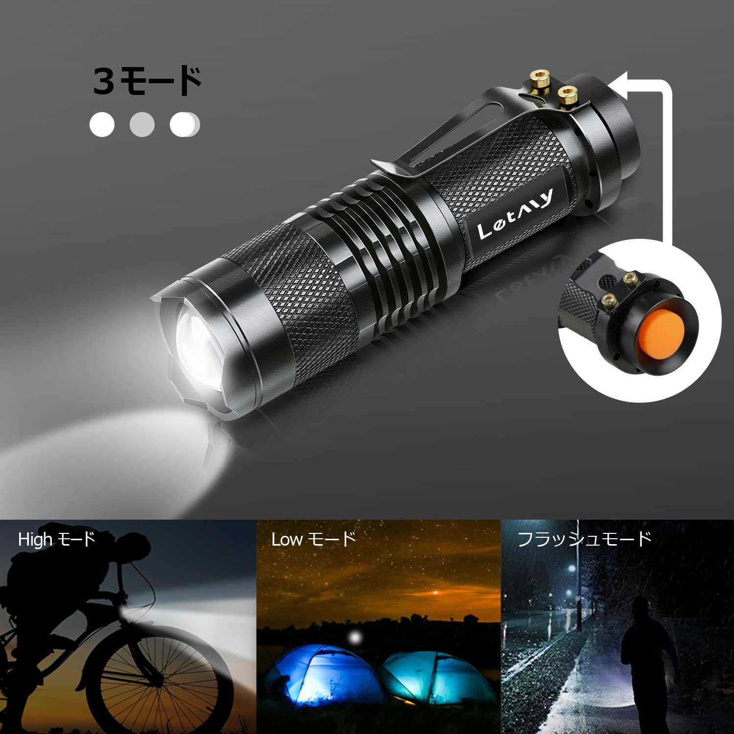 Push at the time of extinction ⇒ Lit in high mode, press again ⇒ Lit in LOW mode, press again ⇒ Lit with flash ⇒ Lights off ⇒ OFF.