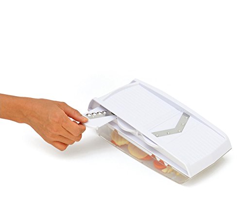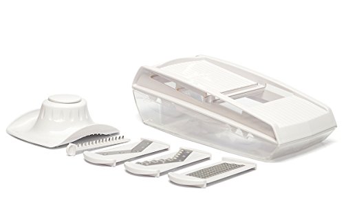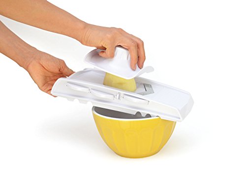 - Feature : ALL-IN-ONE 7PC SET - This handy, all-in-one 7 piece set features 4 different types of stainless steel blades for variety of slicing, grating & cutting that make it easy to prep everything from veggies to cheese, fruits and even chocolate. / FAST SWITCH OF BLADES - The blades are stored right inside the mandoline itself so you will never have to search for the right blade again and easily switch to different of blades. / 4 STAINLESS STEEL BLADES - This set features 4 different types of stainless steel blades for variety of slicing, grating & crinkle cuts. / PREP FOOD WITHOUT A MESS - This all-in-one comes with a food container base for less of a mess on the kitchen counter. / 100% SATISFACTION - We stand behind our products so if you are not satisfied. Let us know and we will offer a full refund or replacement with no questions asked.