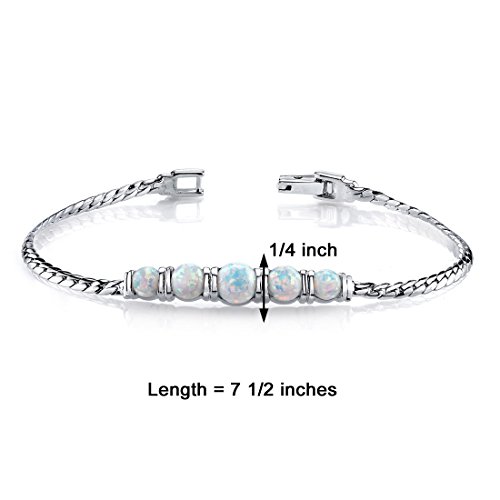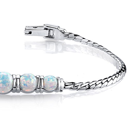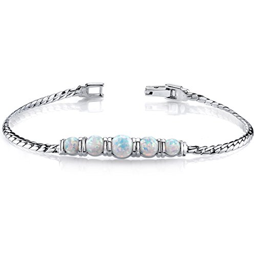 Gemstones: Lab Created White Opal, Round Cabochon Shape, 1 piece 7mm, 2 pieces 6mm, 2 pieces 5mm, shimmering Multi-color hues, 3.75 Total Carat Weight. Bracelet: 7.4 grams pure Sterling Silver with .925 Stamp. Bracelet features exceptional Design, Craftsmanship and Rhodium finishing. Perfect gift for Mothers Day, Birthdays, Valentines Day, Graduation, Christmas or just about any other occasion. Money Back Guarantee. Includes a Signature Gift Box. Style SB4334Feature