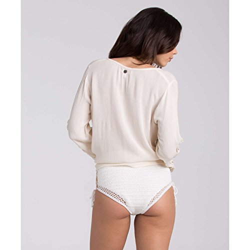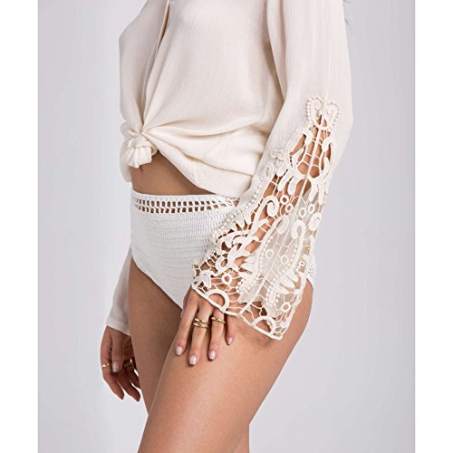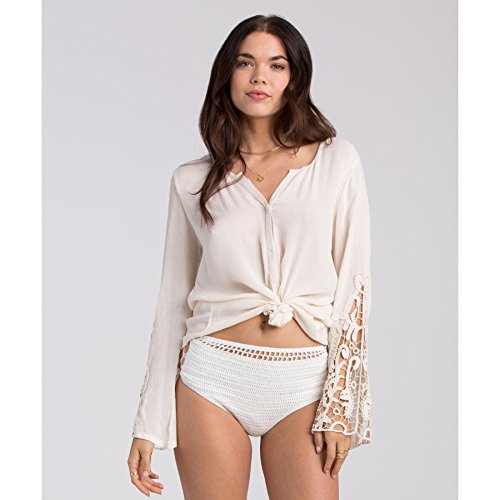 Woven long, bell-sleeved top with crochet lace detail on sleeves and button front placket.