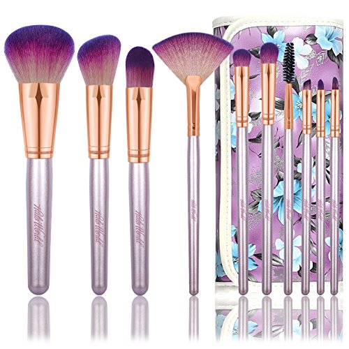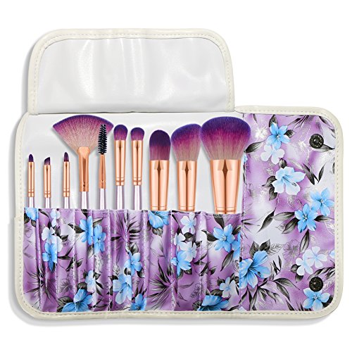 Halo World 10 Piece Makeup Brush Set Eye Face Foundation Blush Brush with Flower Pattern PU Case (Rose Gold)