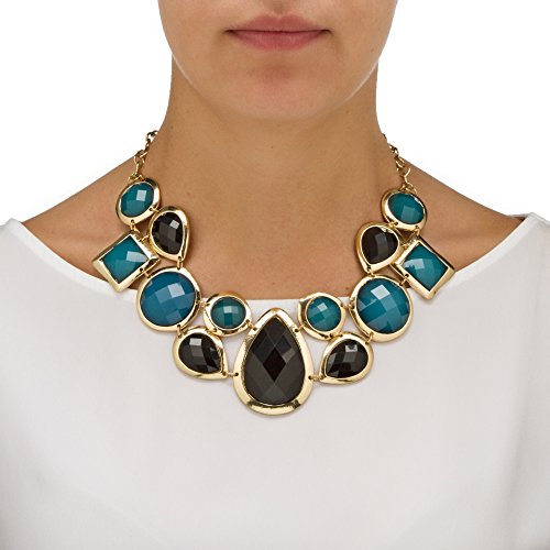 This set is all exquisite drama. You'll turn heads in this black and teal geometric jewelry set. Includes adjustable 18" - 201/2" statement necklace and earrings. Yellow gold tone. - 54848Feature