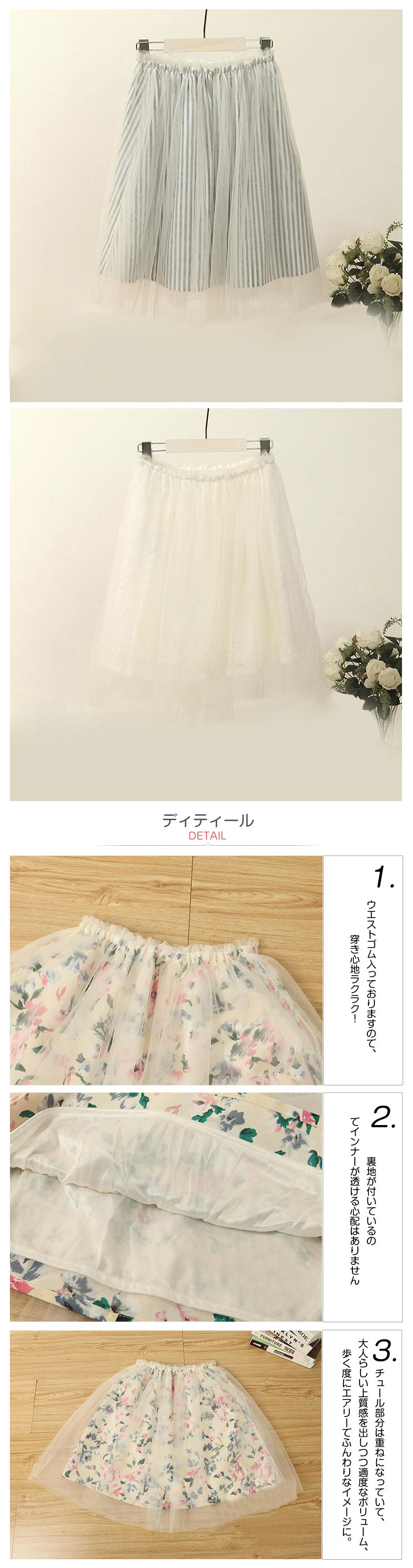 | カジュアルにもフェミニンにもOKなチュールスカートは、今季絶対持っておきたいひと品?ボリューム たっぷりのフレアラインで、歩くたびにふんわり愛されシルエット!春らしい花柄から定番のボーダーまで選べる6色!パンプスはもちろん、スニーカー とのこなれカジュアルコーデも◎ウエストもゴム仕様なのでストレスを感じさせず、TOPSをインしやすい一着です☆ | |