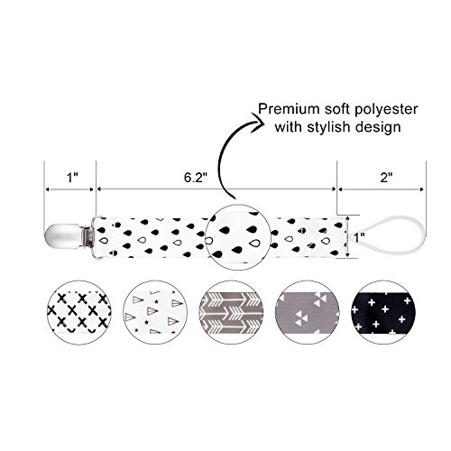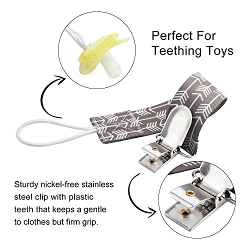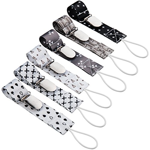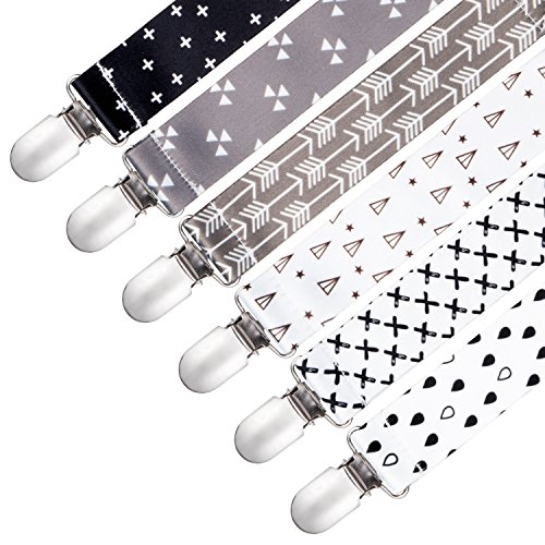 -. Feature : 6-Pack Stylish and Practical Baby Pacifier Clips That Both Moms and Babies Love -- A variety set including 6 different designs of baby pacifier holder, which not only helps to keep baby's teething ring in place, but also are stylish accessories for babies daily outfit. / Good for use -- The special design of metal clip with plastic teeth makes it easier to attach and take off. Meanwhile keeps the pacifier clip stays on baby's clothes / bibs securely. / Safer for Every Baby -- The stylish pacifier leash are made out of washable, durable, soft, high quality polyester with very comfortable touch. Clip which has plastic teeth hold tight but will never damage baby's clothes or discomfort the baby. / Universal Fit -- The pacifier clips are on good length for soothies, pacifiers, teething toys, baby blankets & drool bibs. Each pacifier holder is 9.2 inches long (including the metal clip and loop) and 1 inch wide. It is an universal pacifier clip and fits to most brands of pacifier and soothers. / Customer Satisfaction Guaranteed -- We offer you 100% Satisfaction or Money-Back Guarantee with no question asked, Order without Risk!