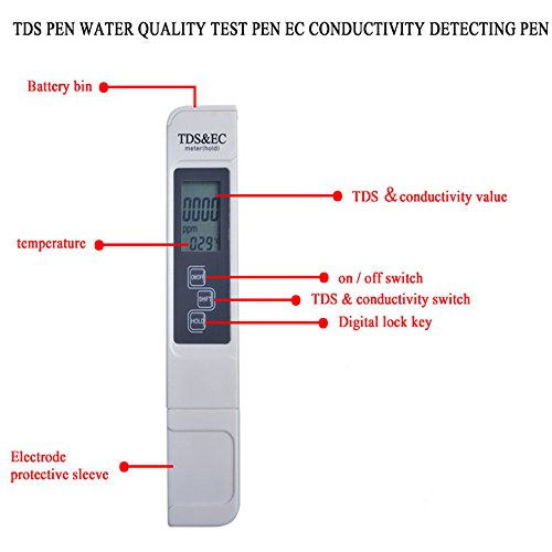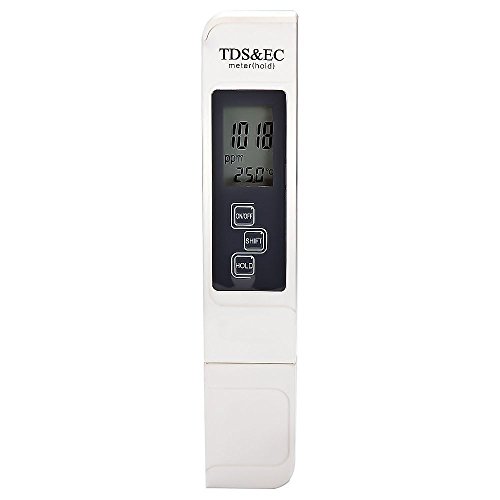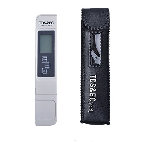 -. Feature : -3-IN-1 PROFESSIONAL QUALITY COMBINATION TDS METER: TDS EC Meter and Temperature Meter / -RANGE: TDS: 0-9999ppm, Conductivity Range: 0-9990us/cm, Celsius range: 0.1-80.0℃, Fahrenheit: 32.0-176.0℉, Accuracy: ±2%. / -MAINLY USED: drinking water, alcohol, storage bin, washing machines, fruits and vegetables, the pool detection, deep well water, water, fertilizer, fish, seafood breeding and soilless cultivation etc. / -FEATURES: Lightweight and portable design, large measuring range, high precision, good versatility and much application and so on. / -PACKAGE: 1 x TDS Water Quality Tester, 1 x Protective Leather Case, 1 x User Manual
