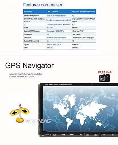 7 Inch Car Radio GPS Navigation In Vehicle DVD Player Bluetooth Back Camera Stereo 2 Din Specifications GPS Navigation GPS Navigation with free map ready(including NA/EU etc) Operating System Windows 8.0 operating system CPU:ARM11+ARM9 833MHZ frequency SD Card Flash Drive USB/TF card port External Memory Up to 32GB/TF Card USB Connection for iPod/iPad/iPhone. Other sellers only have the Cable for iPod. Multi Function Touch Screen, Steering Wheel Control, GPS,RDS, SD/USB Support, FM Transmitter, Subwoofer Output, 3D Interface, iPod, Built-in Bluetooth Touchscreen 2DIN 7inch TFT touch screen Display Ratio 16:9 Screen Size 7 inch Screen Resolution 800 x 480 OSD Languages English, Chinese, French,Portuguese, Deutsch,Spanish, Dutch, Russian Media Type Support HD720P,1080P,RMVB video,almost full video format JPG, RMVB, DVD, DVD-RAM, JPEG, Mp3, VCD, CD-R/RW, MPEG4, DVD+R/RW, PDF, PNG, DIVX, Mp4, WMA, CD+R/RW, CD, AVI, DVD-R/RW Radio Response Bandwidth AM: 522 KHz-1620 KHz;FM: 87.5 MHz-108 MHzCountry:China,Europe,Eastern,Russia,USA1,USA2,Japan Bluetooth Bluetooth Version V2.0 Support phonebook Yes Dual Zone Function Yes, can play music or movie when navigation What's in the box Power cable x 1 GPS antenna x 1 Mounting bracket x 1 USB cable x 1 User's manual x 1 Remote control x 1 GPS SD map card x 1 Rear camera x 1Feature