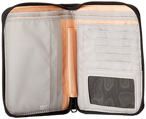-. Feature : Elegantly designed women's wallet with built-in organization, a detachable wrist strap, and RFIDsafe protection / RFIDsafe blocking material built into wallet helps protect IDs and credit cards from hacker scanning / Zippered closure; two note slots; six card slots; three sideway compartments / Measures 5.1 x 6.7 x 0.6 inches (HxWxD); weighs 5 ounces / Pockets: 5 interior slip, 1 exterior, 1 ID window, 5 card slots