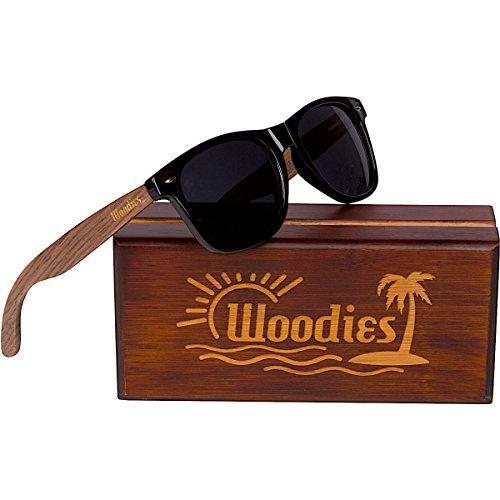 Woodies Walnut Wood Sunglasses offer a combination of 100% Walnut Wood arms that support a wayfarer style plastic frame. Each pair is completely unique and has its own wood striations. The lightweight Walnut Wood offers a comfortable fit that is durable and sturdy at the same time. Our unique stainless-steel, double-spring hinges are sturdy and designed to keep their shape year after year. The lenses are specially designed so that they are both dark and polarized, offering 100% UVA/UVB protection even in intense lighting conditions. These glasses are stylish, durable, and natural. Each pair comes in a real bamboo wood box, a microfiber lens cleaning cloth and a wood guitar pick! 30-Day Money back GuaranteeFeature