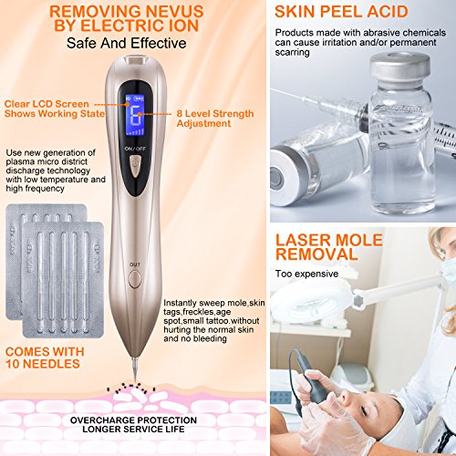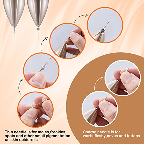- MULTI-FUNCTIONAL & PRACTICAL: This beauty plasma pen included 2 kinds of needles and 6 strength levels adjustable which can meet your different needs. The coarse needle and 4-6 level is for warts, fleshy, nevus and tattoos, the 10 thin needle and 1-3 level is for moles, freckles, spots and other small pigmentation on skin epidermis.