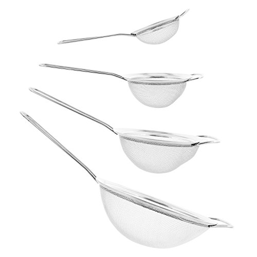 - ESSENTIAL SIZES NEEDED FOR ANY TASK: The right assortment of strainer sizes allows you to save time, and be more more efficient in the kitchen! Set includes 3", 4", 5.5" and 8" strainer sizes, which are the most popular and preferred sizes needed to handle all your straining, sieving, sifting, filtering and rinsing tasks. Nest the strainers together for space saving storage or hang them together within reach of where you use them the most. Easy to clean and dishwasher safe.