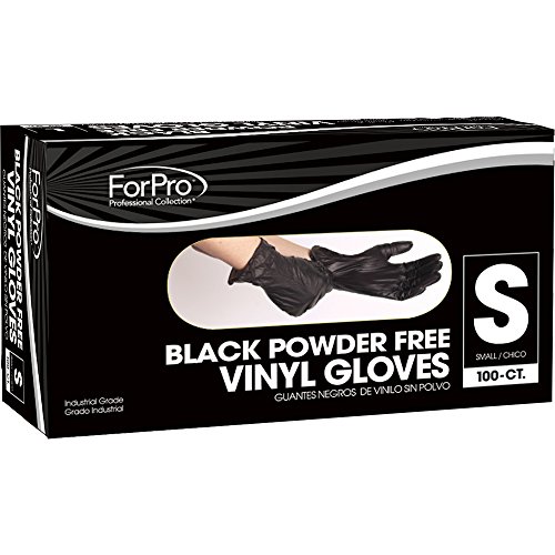 ReleaseDate : 2013-07-11 Studio : For Pro Publisher : For Pro Binding : Health and Beauty Product Description Black powder free vinyl gloves are industrial grade. Small 100 count. Disposable. Superior strength and durability. Textured finish or superior grip. Ambidextrous. Non-sterile. Single use only. Beaded cuff. Latex free. Premium synthetic vinyl. More resistant to certain chemicals than latex. Comfortable fit reduces hand fatigue. Available in small, medium and large sizes. 2. 9 mil palm, 3. 9 mil finger. Case of 1,000 gloves packed 10/100good quality gloves provide a biological barrier and are not intended to be used as a chemical barrier. Storage: store in a dry, ventilated area. Avoid direct sunlight, fluorescent lighting, heat and moisture. Do not store above 100 degrees fahrenheit (37 degrees celsius). Users should consider the circumstances of use in deciding to remove residual powder from gloves after donning. Powder can be removed by wiping gloves thoroughly with a sterile wet sponge, wet towel or other effect count five method. Components used in the manufacture of gloves may cause allergic react ion in some users. Follow your institution's policy for use. Proposition 65 this product contains chemicals known to the state of California to cause cancer and/or birth defect s or other reproductive harm. ISO 9001 certified. 0
