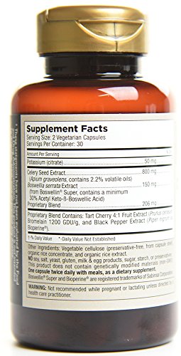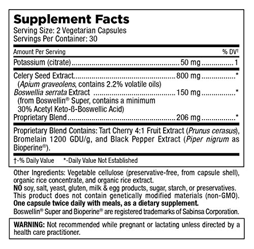 -. Feature : Supports Healthy Uric Acid Levels / Contains celery seed extract to support normal uric acid levels / Contains Boswellin extract, clinically shown to support the body's response to inflammation cycle / Reinforces the body's normal fluid output / Increased Bio Availability with Bromelain and Bioperine