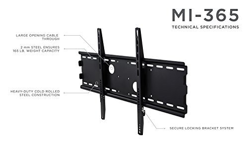 -. Binding : Electronics -. Brand : Mount-It! -. EAN : 0628586253148 -. Feature : Low-Profile Flat Wall Mount / Will fit most large-sized flat panel plasma and LCD TVs with mounting patterns up to VESA 600X400 / Mounting holes on television should be 30" or less apart horizontally & 18.5" orless apart vertically / Maximum weight capacity: 75kg / 165lbs / TV stays only 1.25" away from the wall. -. Label : Mount-It! -. Manufacturer : Mount-It! -. Model : MI-365B -. MPN : MI-365B -. PackageQuantity : 1 -. PartNumber : MI-365B -. ProductGroup : Speakers -. ProductTypeName : AV_FURNITURE -. Publisher : Mount-It! -. Studio : Mount-It! -. Title : Mount-It! Super Low-Profile Fixed TV Wall Mount for 32-63" LCD / LED / Plasma TVs -. UPC : 628586253148