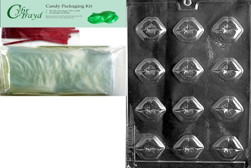 Cybrtrayd Mdk25R-V052 B.S. Kiss Lips Valentine Chocolate Candy Mold with Packaging Bundle, Includes 25 Cello Bags, 25 Red Twist Ties, Chocolate Molding Instructions