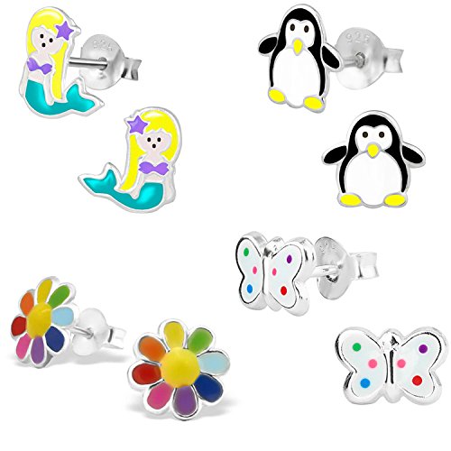 -. Feature : Jewelries4You children's earrings / .925 Sterling Silver girls' earrings, safe for sensitive ears / Mermaid Penguin Flower Butterfly earrings set for girls / Earring face Size: Mermaid 8.25mm x 9mm, Penguin 7.15mm x 7.65mm, Flower 7.65mm x 7.65mm, Butterfly 6.3mm x 9.4mm / Supplied in a pink velvet bag