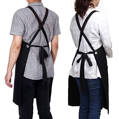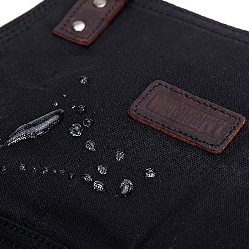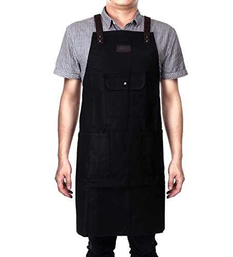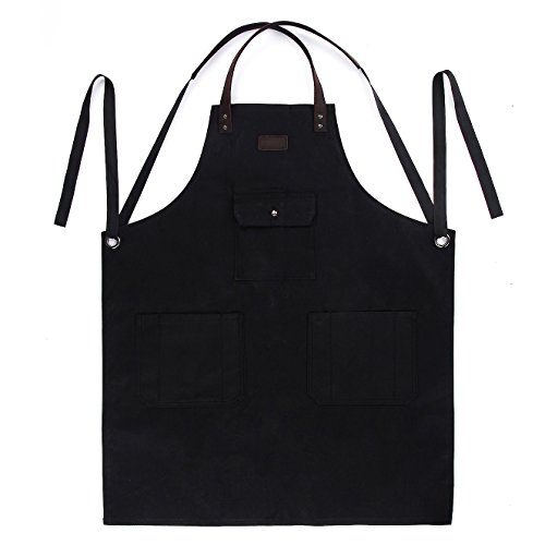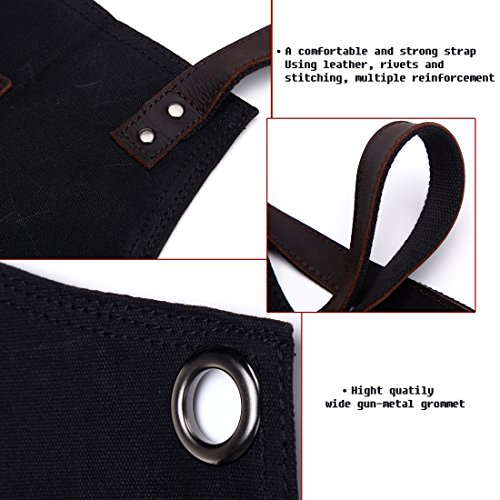 HIGH-GRADE MATERIAL & MADE-TO-LAST: Made of premium quality high density black 16 oz waxed canvas and genuine cowhide leather, heavy duty hardware, this water resistant & rugged canvas bib apron can stand wear and tear. Pockets are double-stitched to hold up to whatever you put in. Straps are reinforced with leather and wide gun-metal grommets to provide extra strength.