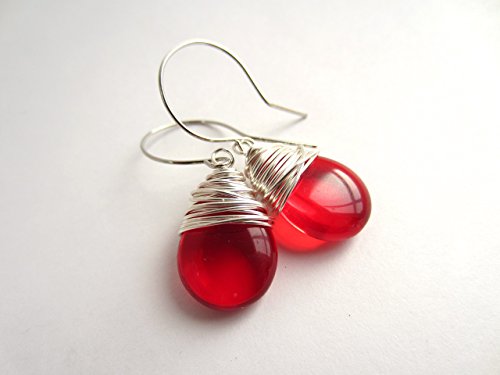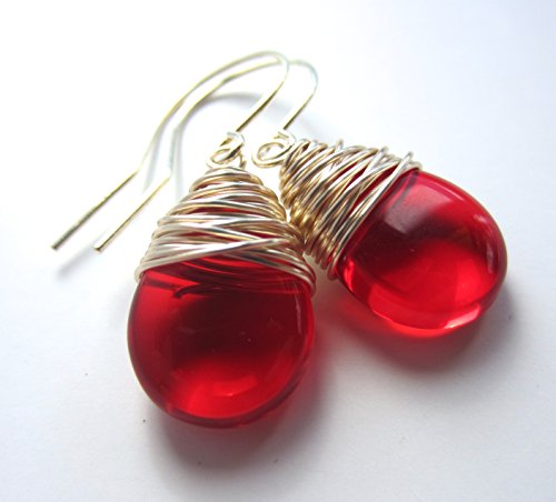 -. Title : Red Wire Wrapped Earrings Czech Glass Drop Earrings Silver Tone Wire