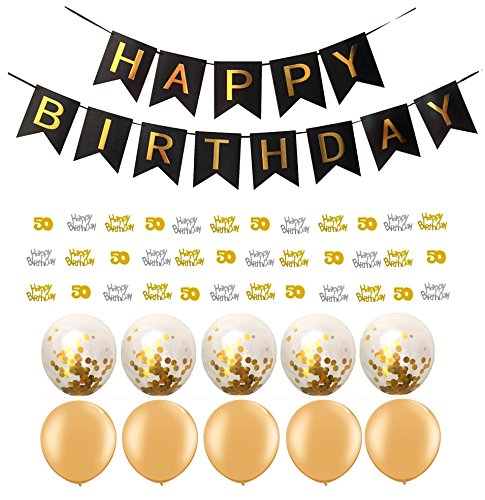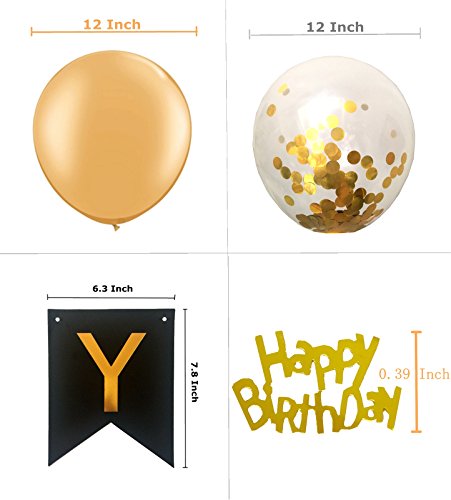 Perfect one-stop shopping for Birthday Party Decoration Kit Included: 1 x “Happy Birthday” banner, Gold Metallic Foil Confettis, 10 pack of 12 inch Balloons