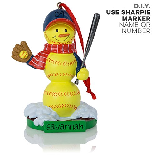 - EASY TO PERSONALIZE! Want to add a special touch to this already awesome Softball Snowman Resin Christmas Ornament? Grab a fine point permanent maker and get ready to customize! The green rectangle at the base of this awesome softball snowman ornament is perfect for adding a name, number, year, or any other fun details you'd like to include. You can even customize one for every member of your softball team! A permanent marker is included with your ornament for quick and easy personalization.