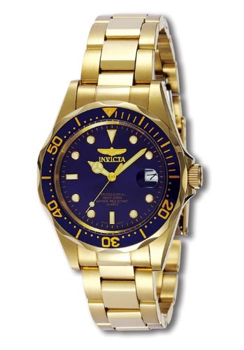 Providing a nostalgic nod to the classic nautical timepiece, the gold-tone Invicta Pro Diver stainless steel men's watch features gold plating and water resistance to 200 meters (660 feet). The round gold-tone stainless steel watch case measures 40mm (1.57 inches) wide and has a blue unidirectional rotating bezel with gold elapsed time markings. It has a blue dial background with large luminous Tritnite hands (with seconds hand) and dotted dial markers. The gold-tone stainless steel bracelet band mixes brushed and polished links, and it's joined by a fold-over-clasp-with-safety. Other features include a scratch-resistant mineral crystal with anti-reflective coating and a date function at 3 o'clock.Pro Diver Collection