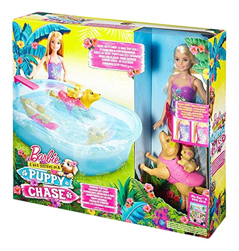 -. Feature : It's the most adorable swimming lesson yet with this Barbie pool play set that includes Barbie doll wearing a color-change swimsuit, swimming mommy dog and puppy! / Inspired by the movie Barbie & Her Sisters in a Puppy Chase, it's complete play right out of the box! / Make waves by placing the mommy dog in the water-filled pool and pushing the button on her back -- she'll swim around and around / Attach the puppy to her mommy's back so she can learn to swim, too! / The fun feature can also be activated with Barbie doll's hand for a totally wow moment!