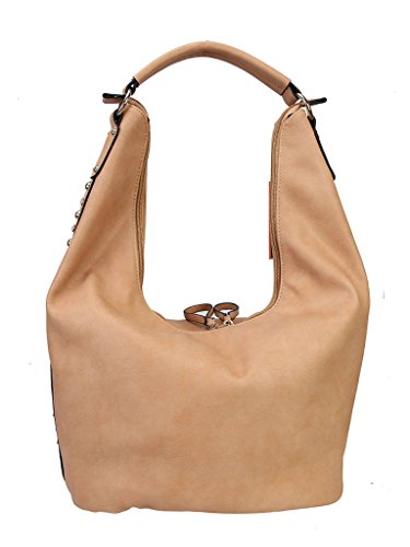 -. Feature : This handbag comes in 5 different colors: Red, Beige, Black, Tan, and Khaki. / High Quality Soft PU Leather Hobo Accented with Studs & Crystal Décor on Both Side Womens Purse Handbag. / High Quality Fabric Lined Interior with Multiple Interior Pockets. 2 Compartments separated by 1 Center Divider Zipper Pocket. 1 Large Pocket Inside with Zipper and Pockets on Both Side. 1 Zippered Pocket Outside in the Back. / Approximate Size info: Length 15" x Width 8" x Height 9" Material: PU Faux Leather. Top Zipper Closure. / Color showing in other color is to show the different variation angles of the handbag. The actual bag ship, will be the one your purchesed.