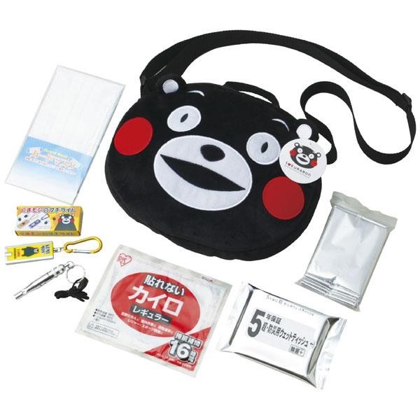 セット内容くまモンのポーチ、くまモンのプチライト(ボタン電池付)、防寒シート、マスク1枚、カイロ、ホイッスル、防災用ウェットティッシュ(20枚入)