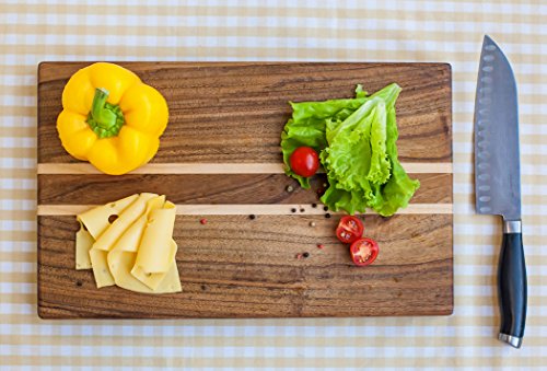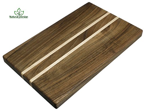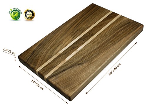 - 100% NATURAL & ECO - FRIENDLY. The cutting board is made exclusively of natural materials - 100% Solid Natural Organic Antibacterial Wood: Walnut with light Maple inserts. Using this board, you can be sure of its naturalness, environmental friendliness and safety for you and your home. Great alternative to plastic boards - does not destroy your knife's edges and will not harbor bacteria.