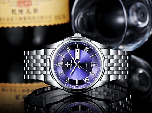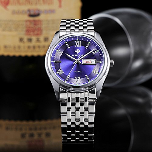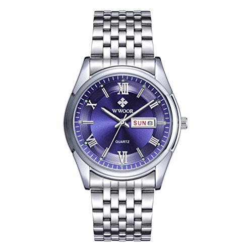 -. Title : Mens Stainless Steel Silver Case Analog Display Watch Men Quartz Date Week Wristwatch Blue