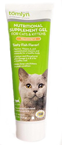 -. Binding : Misc. -. Brand : Tom Lyn -. EAN : 0030521067800 -. Feature : High-quality daily vitamin and mineral supplement to meet cats' and kittens' special nutritional needs / Concentrated formula: more vitamins and minerals for less / Tasty Fish Flavor / 100% Satisfaction Guaranteed! / Essential for the development of the eyes and heart / Felovite II contains vitamin A, D, E, minerals and calcium / Natural tuna flavor ideal for cats -. IsAutographed : 0 -. IsMemorabilia : 0 -. Label : Vétoquinol USA OTC -. Manufacturer : Vétoquinol USA OTC -. Model : 30521067800 -. MPN : 411474 -. NumberOfItems : 1 -. PackageQuantity : 1 -. PartNumber : 411474 -. ProductGroup : Pet Products -. ProductTypeName : PET_SUPPLIES -. Publisher : Vétoquinol USA OTC -. Size : 2.5 -. Studio : Vétoquinol USA OTC -. Title : Tomlyn Nutritional Supplement Gel (Felovite II®) Cats and Kittens 2.5 oz -. UPC : 030521067800