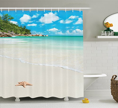 Ambesonne Ocean Decor Collection, Big Starfish at Sandy Tropic Beach with Crystal Clear Sea Exotic Island Dream Spaces, Polyester Fabric Bathroom Shower Curtain Set with Hooks, Cream Turquoise