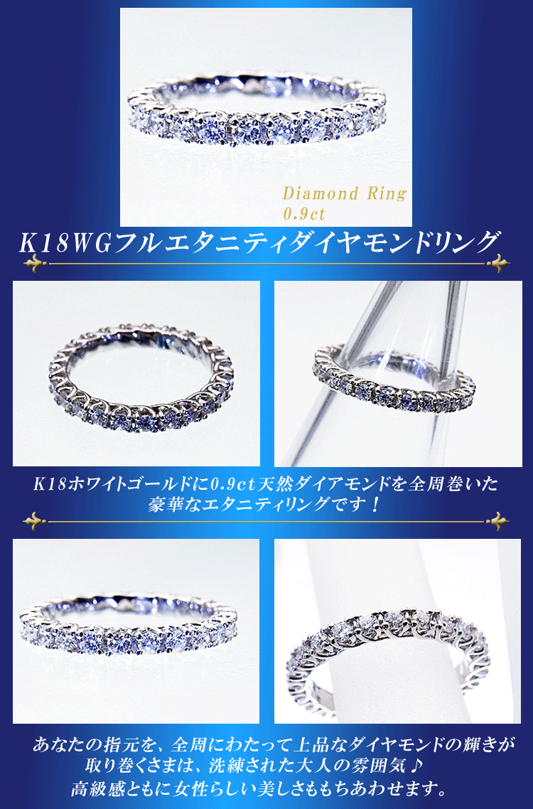 商品説明 K18ホワイトゴールドの全周にトータル0.9ct天然ダイヤモンドを巻いた綺麗なリングです。