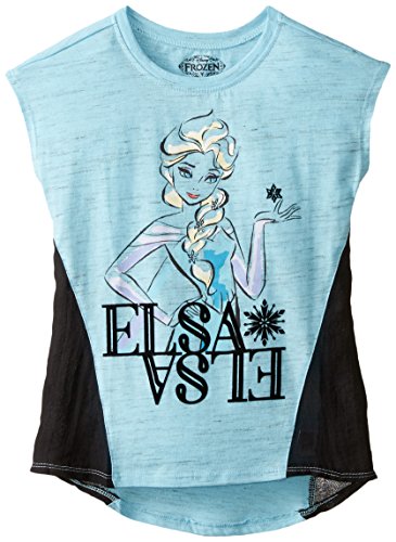 Frozen Big Girls' Elsa Space Dye Top with Chiffon Inserts, Light Blue Heather, Large