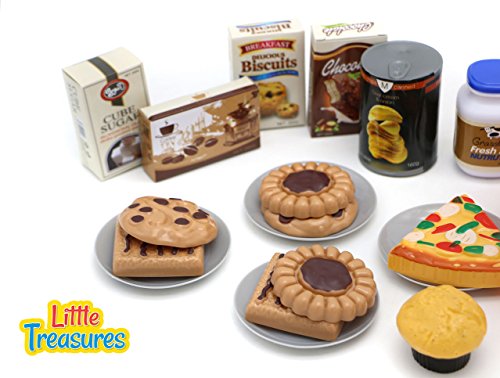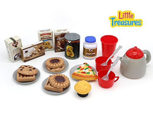 - Title : Tasty Treats Play Food Snack Set - 24 pcs tea with fresh milk, coffee beans, sugar, biscuits, chocolate ice cream, pizza & potato chips, a kettle and a pair of cups, saucers and spoons, for 3+ kids