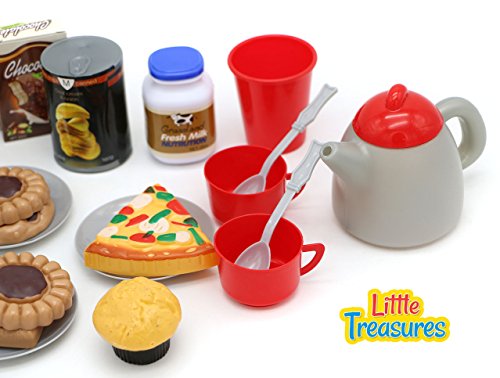 - Feature : Kids PARTY: A mini tea/snack toy set which consists of all the needed cutlery; a plastic glass, a pair of saucers, two snack plates, a pair of cups and spoons as well as a large kettle with removable lid / The food items or snacks collection includes packets of fresh milk, biscuits, coffee beans, sugar cubes, canned potato chips, cookies, brownies, and cupcake and pizza slice toy models. / MINIATURE FUN: This play set will offer all the fun and excitement of arranging a small tea party by your daughter or her friends. The colors of utensils or cutlery are soft yet chic, while the food snack models are painted in realistic tones, giving a fresh look to the entire assemblage. / LEARNING OUTCOME: Get your little one this toy play set for fun with learning play time and a direct objective towards teaching the usage of cutlery as well as encouraging realistic role play for developing motor skills and hand-eye coordination. / SATISFACTION GUARANTEED: The Toy play set is packed in a detailed, colorful box with instructions included! 100% satisfaction guaranteed - if you are not happy with the toy for any reason, you can get a hassle free refund.