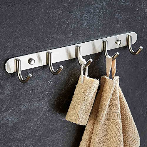 Mellewell Towel Hook Rail Coat Rack 13.9 inches with 5 Heavy Duty Hooks, Strong Bathroom Kitchen Organizer Wall Hanger Hooks, Brushed Stainless Steel, 08001HK05