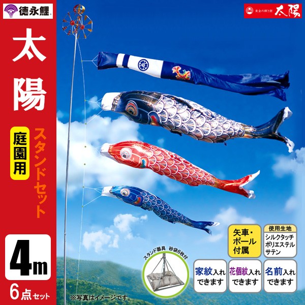 こいのぼり/鯉のぼり 庭園用スタンドセット(紋入れ・名前入りは別料金になります)鯉のぼり 室内用 鯉のぼり ポール 鯉のぼり マンション 鯉のぼり 庭 園用 鯉のぼり 手作り 久月鯉のぼり 鯉のぼり ポール 鯉のぼり 徳永 取扱(セット内容)・吹流し4m・黒鯉4m・赤鯉3m・青鯉2m・矢車一式・ロープ20m・ポール6.8m(7本継)・砂袋6枚入り・ハーケン3本・補助ロープ黄金の輝き鯉 太陽 「太陽」、それは私達人類にとって父であり、神なる存在です。全ての生命の源でもあります。その偉大なる太陽をテーマにした黄金の輝き鯉です。黄金の輝き鯉 太陽は名前の通り、お子様がより輝き、より強く、より大きくと願いを込めて大空を泳ぎ続けます。生地にはシルクタッチの最高級ポリエステルサテン素材を使用し、太陽光線を浴びると白銀色に輝きます。鯉のぼり全体が虹色に輝くよう、濃淡のぼかしでデザインし、その上にアルミ金箔をちりばめ豪華絢爛に仕上げました。また、吹流しには、日本の伝統色藍染め色に、縁起の良いのしめ柄を染め上げ、より高貴に、よりシンプルになっており、日本の空に合った吹流しになってます。