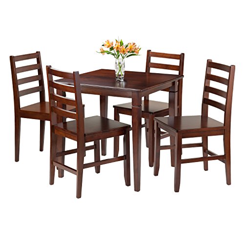 -. Feature : Set includes table and 4 ladder back chairs / Made from solid and composite wood / Warm walnut finish / Routed detail on tapered legs / Ladder back chair design