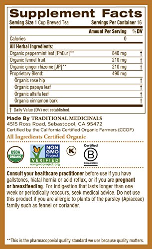 -. Feature : Promotes Healthy Digestion* / Non-GMO Project verified; All Ingredients Certified Organic; Kosher / Herbal Supplement. The highest quality, pharmacopoeial grade herbs / Taste: A refreshingly aromatic blend of tastes-spicy, sweet and pepperminty / 1 box containing 16 sealed tea bags