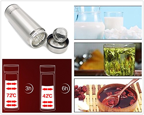 - No chemical leaching or metallic taste--Made of high boron glass liner,you won't worry about the toxic chemical or heavy metal in your water.Healthy and Useful Vacuum Flask Travel Mug.This vacuum bottle belongs with you.