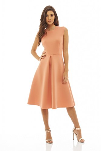 -. Binding : Apparel -. Brand : AxParis -. Department : womens -. Feature : This simple yet stylish peach raw edged scuba skater dress is a must have this season! This sleeveless style with its midi length will accentuate your waist whilst keeping your look modest. Simply pair with some lace up heels and a clutch for a night on the town. / Fabric Composition: 92% Polyester 8% Spandex -. ProductGroup : Apparel -. ProductTypeName : DRESS -. Title : AX Paris Women's Scuba Midi Skater Dress